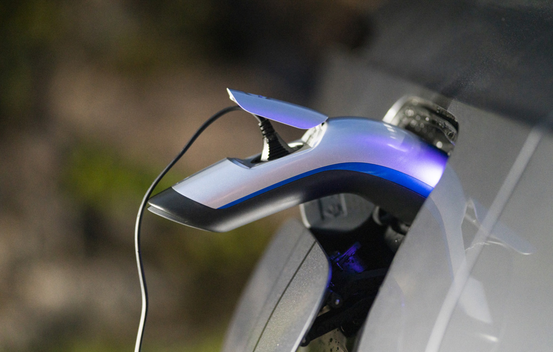 Finn frem AC-utladingspistolen, denne finner du på «nødladeren» som fulgte med bilen. Koble fra ledningen. Kontroller at utladingspluggen og AC-ladekontakten er rene og frie for smuss, og plugg den i bilen.